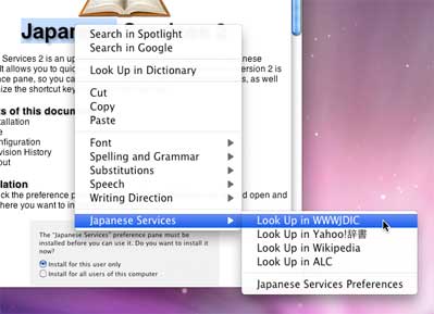 There are three services installed by default. Using the installed services, you can look up words in online dictionaries by selecting the text and either pressing the shortcut key, or selecting the service manually from the Services menu.