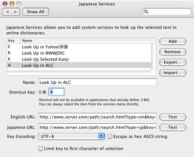 Note: ALC has changed their URL scheme, which is not reflected in this portion of the tutorial.Japanese Services 2 adds the ability to add your own custom services. Let's add a new service to look up words in the Space ALC dictionary. Open up the Japanese Services Preference Pane in System Preferences. Click the "Add" button next to the list of services, and type in a name and shortcut key for the new service.